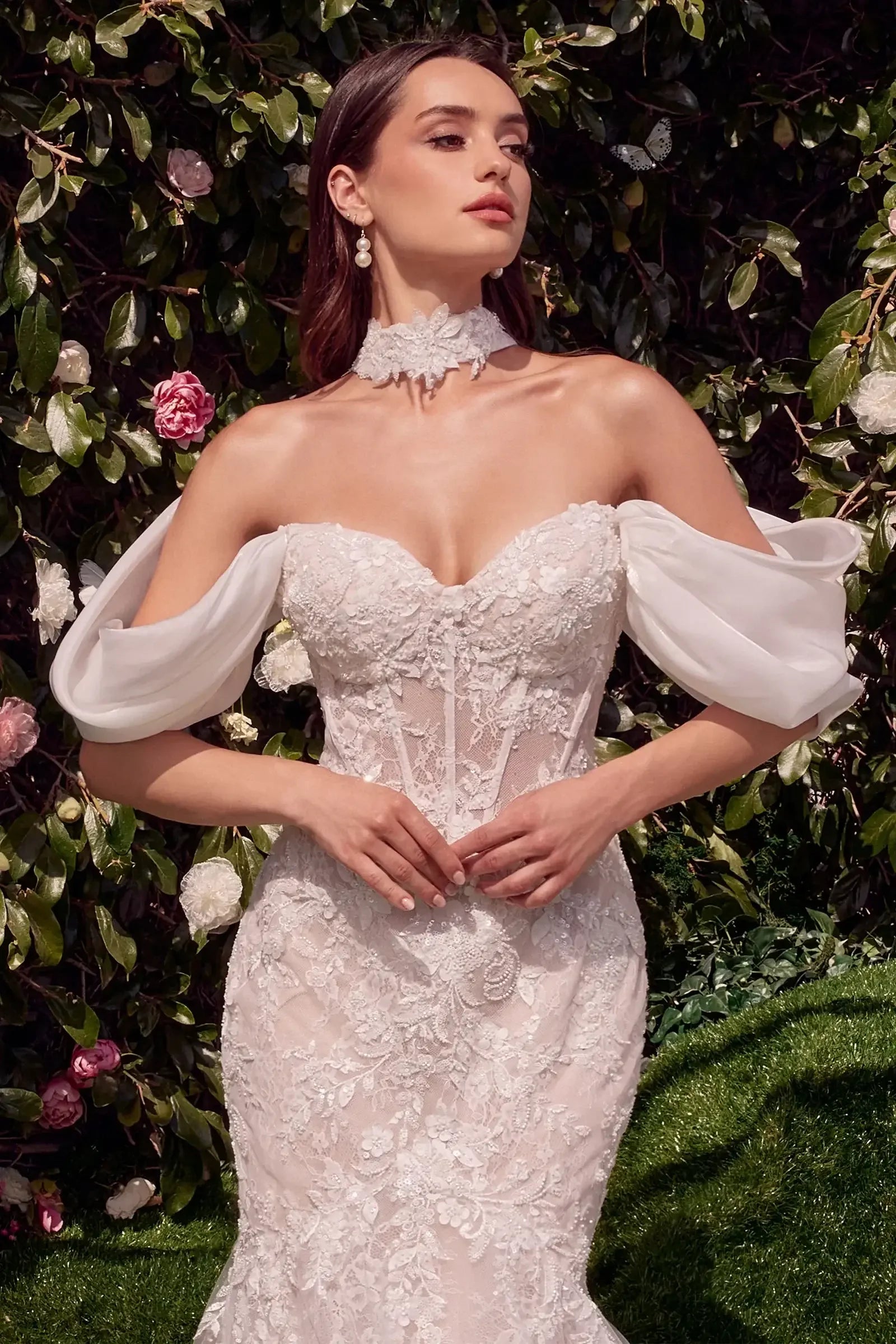 This elegant strapless mermaid gown features a sweetheart neckline and a structured bodice, offering enhanced support and a flattering silhouette. Crafted from layered lace, the gown exudes sophistication, while the removable off-the-shoulder organza shawl adds a romantic and graceful touch. Perfect as a wedding dress, this gown embodies timeless elegance and charm, making it the ideal choice for your special day.