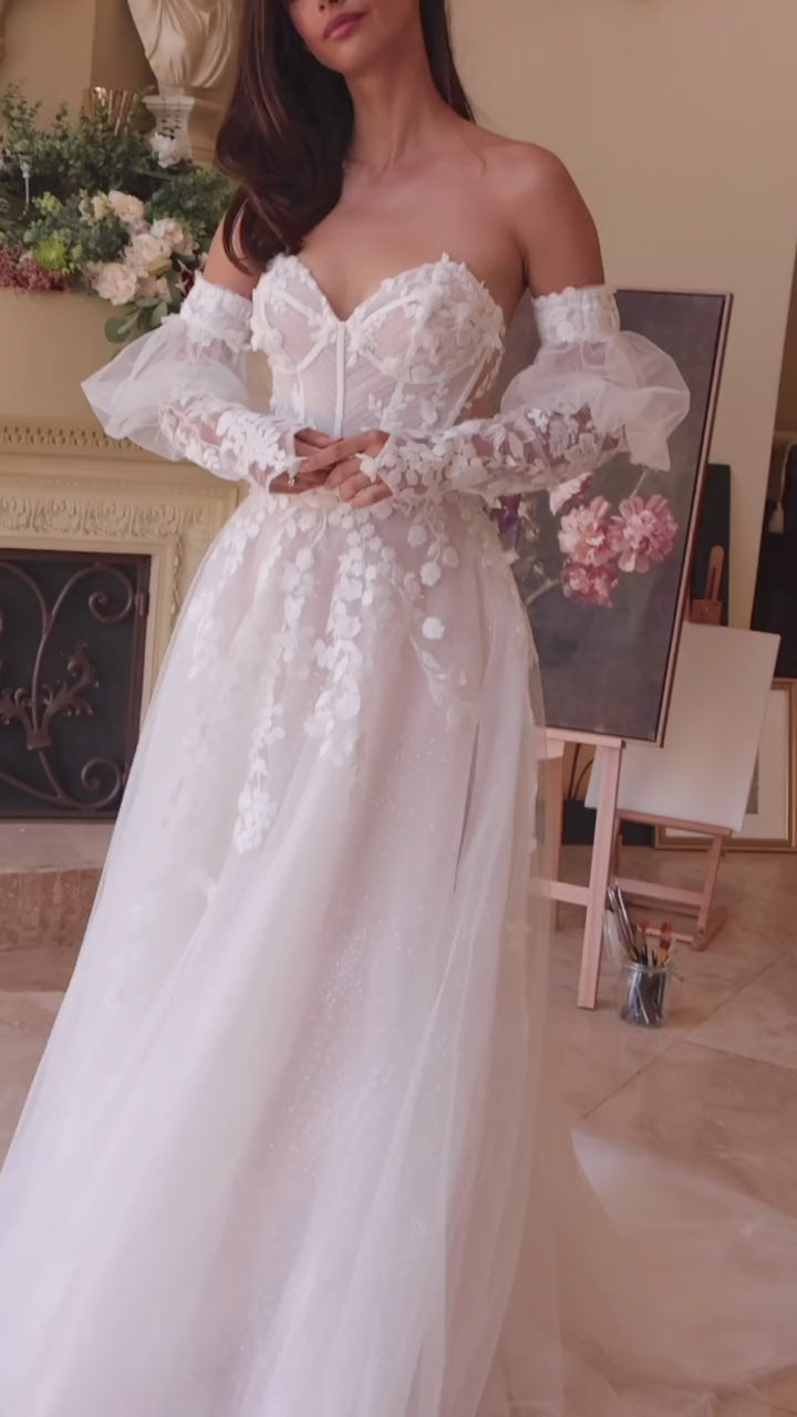 This stunning strapless ball gown features a sweetheart neckline and a sheer bodice, beautifully adorned with scattered lace appliqués for a romantic touch. The structured bodice offers enhanced support, while the flowing A-line skirt crafted from layered tulle adds a dreamy, ethereal quality to your silhouette. Complete the look with the removable matching puff sleeve gloves, making this gown the perfect choice for a wedding dress or bridal gown that radiates elegance and grace.