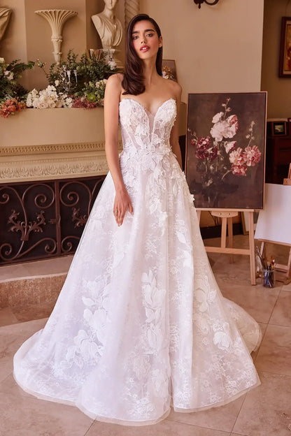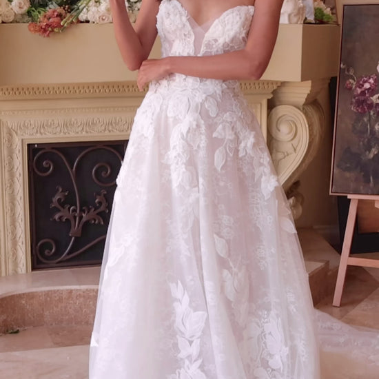 This enchanting ball gown features a deep sweetheart strapless neckline, beautifully adorned with intricate floral lace appliqué for a breathtaking bridal look. The layered lace and delicate floral details add depth and romance, while the graceful A-line silhouette enhances your figure with timeless elegance. Perfect as a wedding dress, this gown exudes romantic sophistication, making it a stunning choice for your special day.