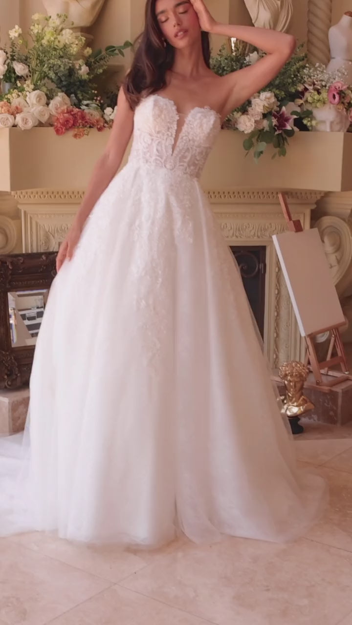 Step into timeless elegance with this strapless ball gown, featuring a deep sweetheart neckline and a lace appliqué bodice that exudes romance. The gown is crafted from layered tulle and lace, creating a voluminous and dreamy silhouette. A structured bodice offers enhanced support for a perfect fit, while the removable long sleeve bolero adds versatility to your bridal look. This gown is an impeccable choice for brides seeking sophistication and charm on their special day.