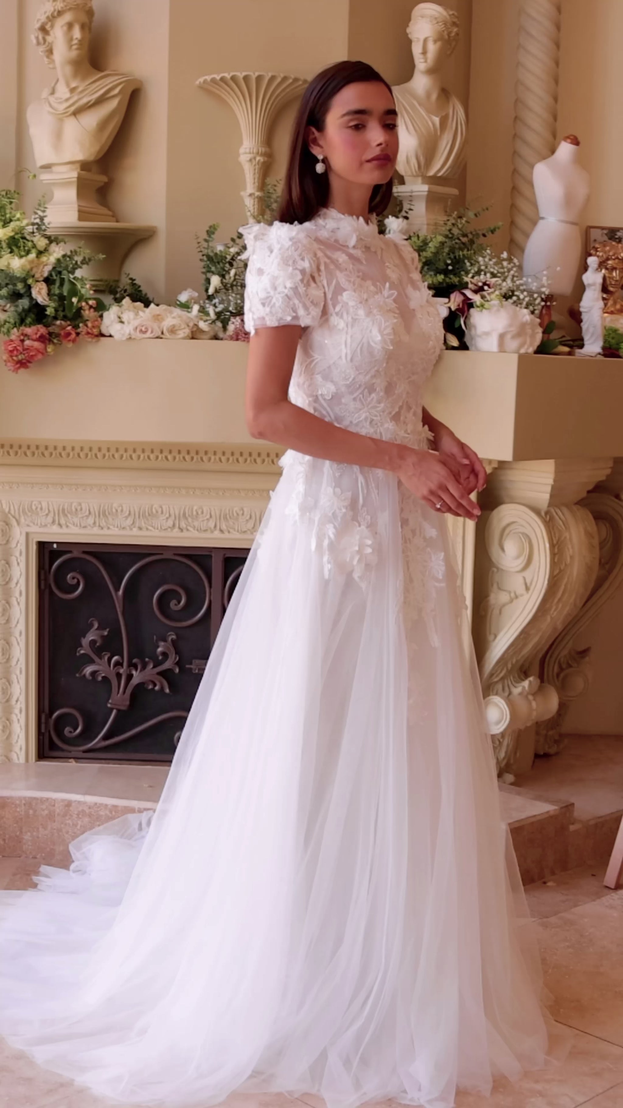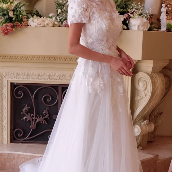 This enchanting ball gown features a strapless sweetheart underdress with a fitted lace bodice, beautifully paired with a removable high neckline and cap sleeves crafted from layered lace and tulle. The elegant A-line overdress adds a dramatic flair, offering versatility for your special day. Ideal for brides seeking a balance of classic romance and modern sophistication, this gown makes a stunning statement.