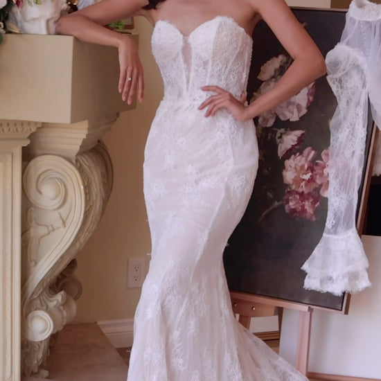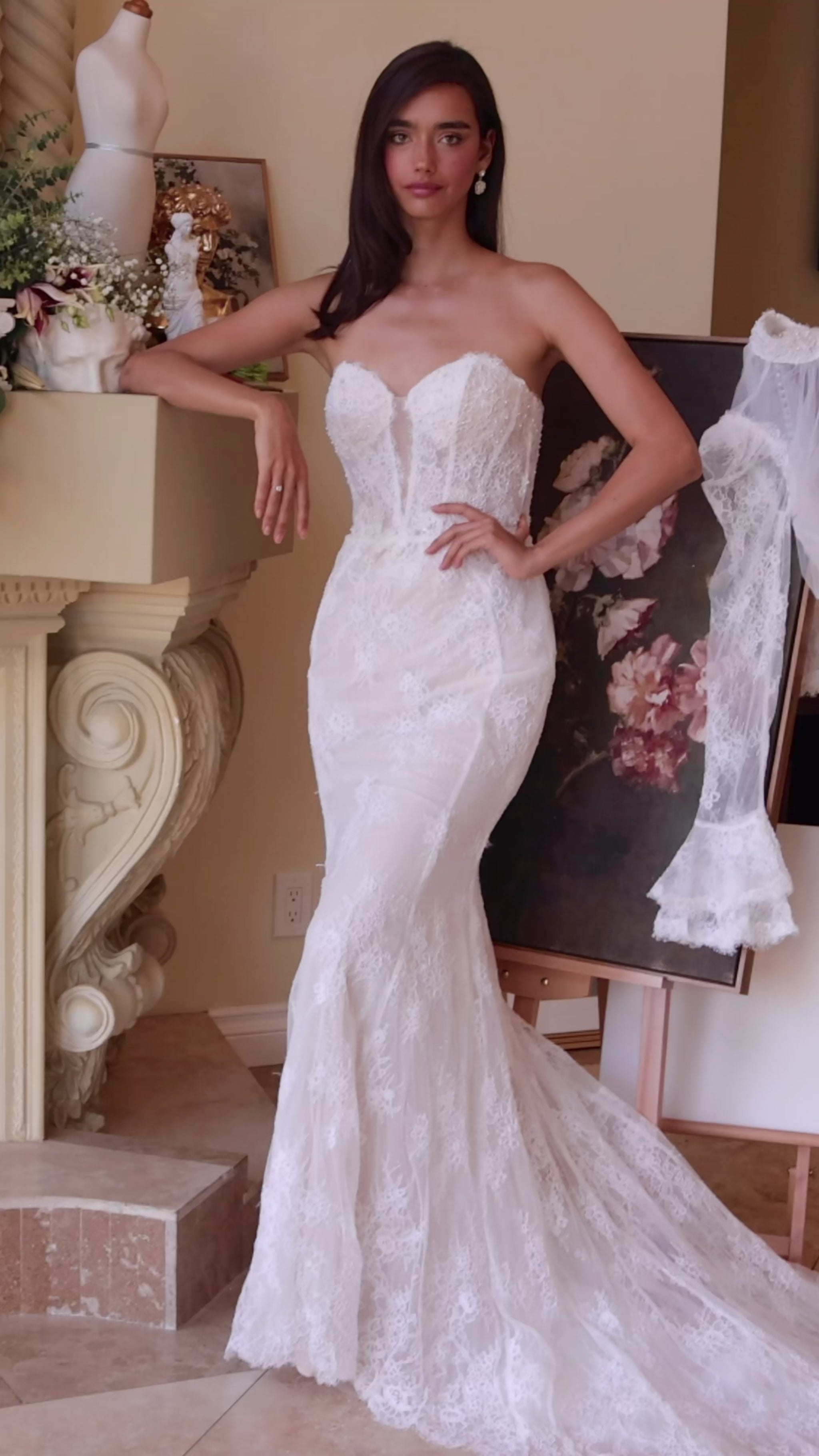 This elegant fitted gown features a strapless sweetheart neckline with a romantic lace overlay. The removable lace long sleeves and sheer gathered high neckline bolero add versatility, offering a chic look for both the ceremony and reception. With a structured bodice for enhanced support and a flattering fit-and-flare silhouette, this dress is the perfect choice for brides seeking timeless beauty and sophistication.