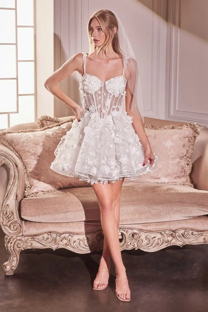 This charming short A-line dress combines playful elegance with timeless romance. It features a sweetheart neckline, sleeveless straps, and a sheer boned bodice for a supportive, structured fit. Layered tulle adorned with scattered lace appliqués adds a delicate, whimsical touch to the design. Perfect for a bridal shower, engagement shoot, bachelorette party, or as a fun reception dress, this gown is an effortlessly stylish choice for special occasions.