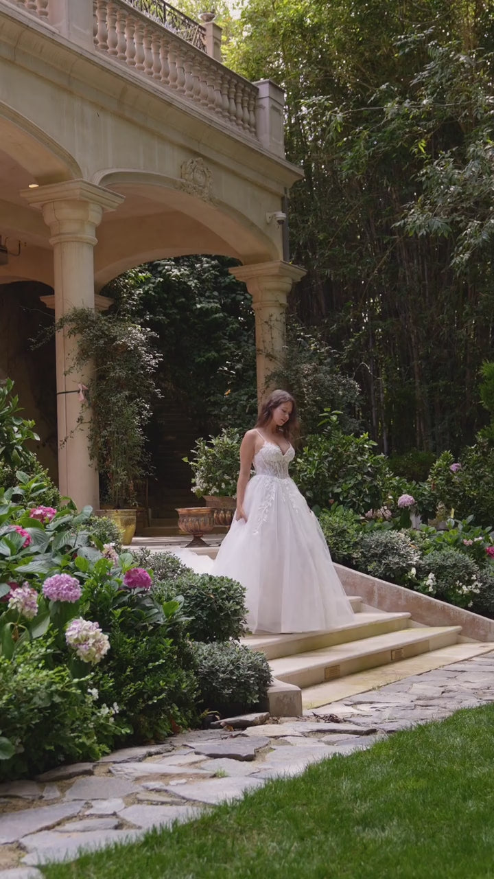 Ethereal and effortlessly graceful, this A-line wedding gown features a sheer corset bodice with delicate lace appliqué and beaded spaghetti straps. The plunging neckline is balanced by the softness of the layered tulle skirt, which flows into a dreamy train with subtle volume. The exposed back and embroidered floral detailing offer a romantic finish, making this gown an enchanting choice for garden weddings and outdoor ceremonies.
