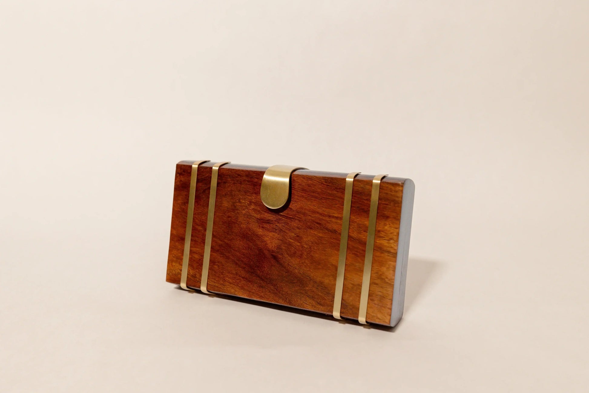 Elevate your style with the Wooden Opulent Clutch, a perfect blend of natural elegance and modern luxury. Crafted from premium wood, each clutch features unique grain patterns and rich, warm hues. Sleek gold-tone metal bars and a matching clasp add sophistication and security, while the detachable gold-tone chain strap offers versatile wear. The interior is lined with soft, black fabric for a striking contrast and protection for your essentials. Ideal for formal events, cocktail parties, or casual outings, this clutch combines timeless design with meticulous craftsmanship.